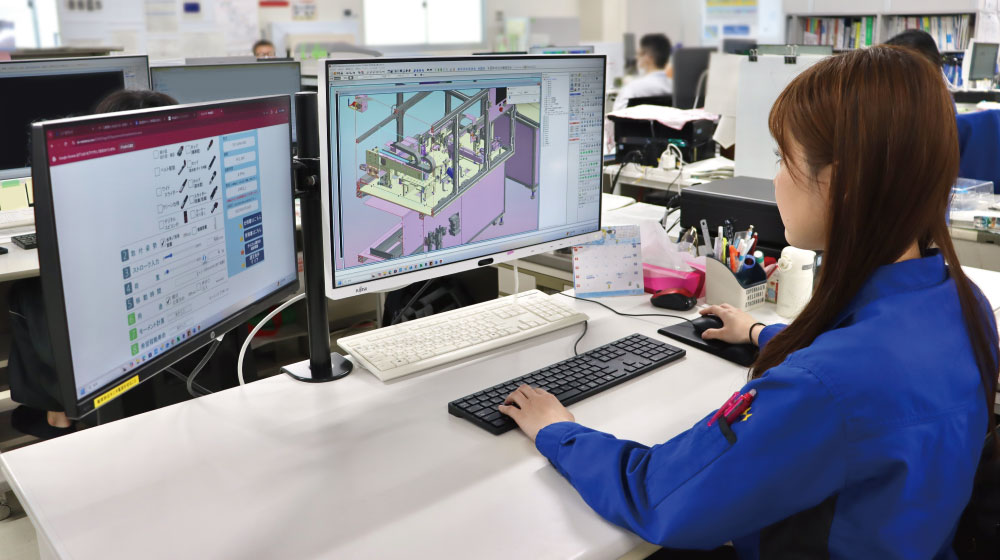 業務内容としては、お客様の仕様に沿いながらCADを用いて構造を考えたり、強度計算をしながら機器の選定を行ったり、図面を描いたりと、検討内容は一つとして同じものがなく、難しくて頭を抱えてしまうものもありますが、グループ内のメンバーにサポートしていただきながら業務を行っています。