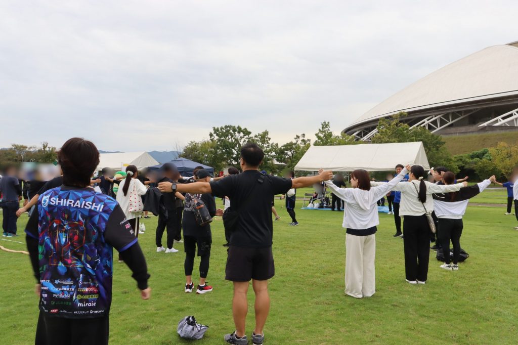 主催者のご挨拶、ルール説明、そしてラジオ体操が行われ、当社社員を含む参加者全員がしっかりと準備運動を行いました。